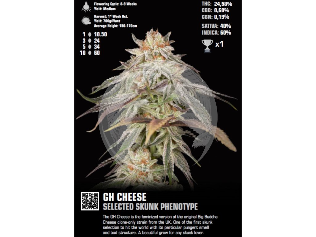GH Cheese patří od 80. let mezi nejznámější semena konopí a s největší pravděpodobností zůstane výraznou součástí katalogů seedbank i v dalších letech. Tato feminized seeds byla původně vyselektována ve Velké Británii ze semen Skunku, kde si rychle získala výraznou oblibu.